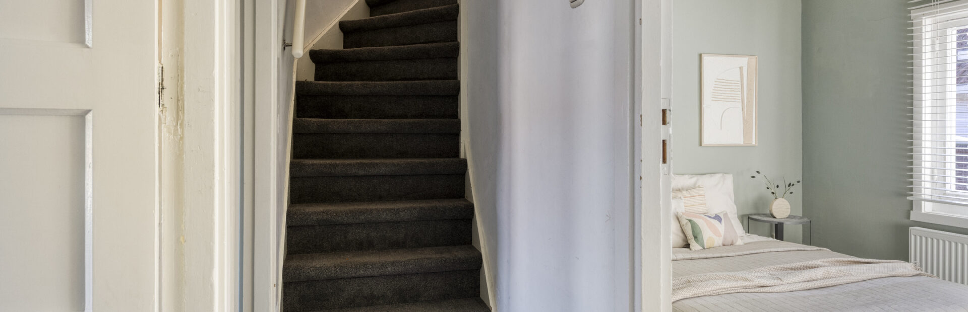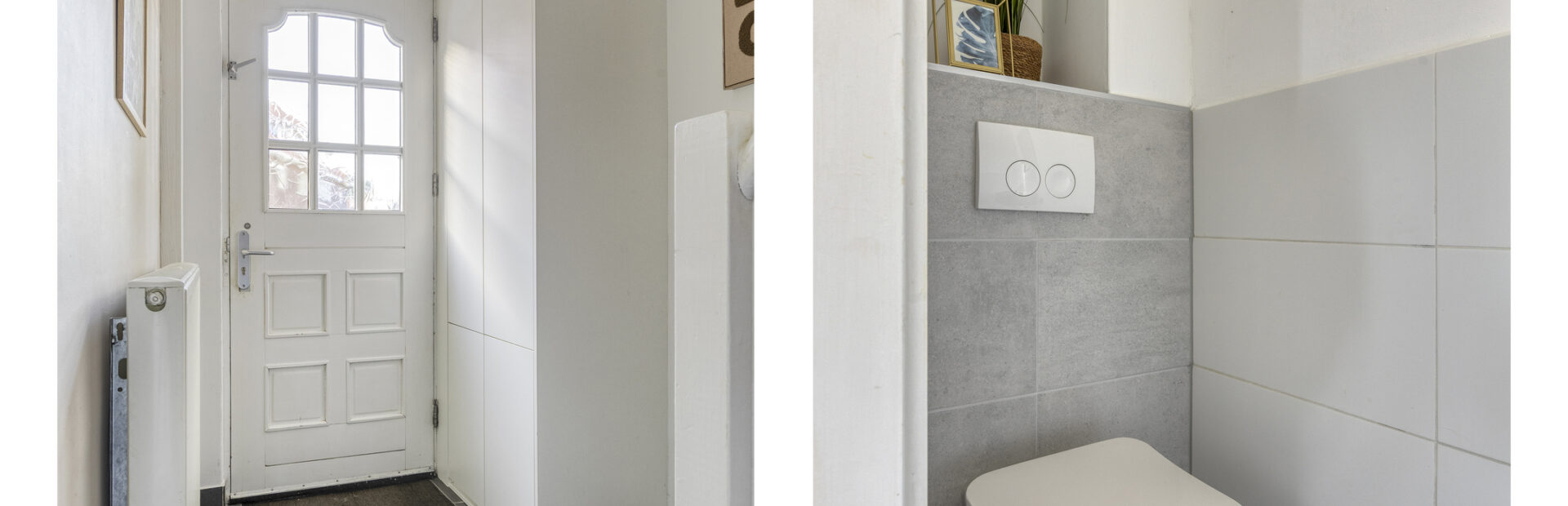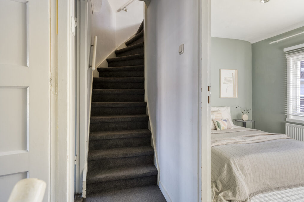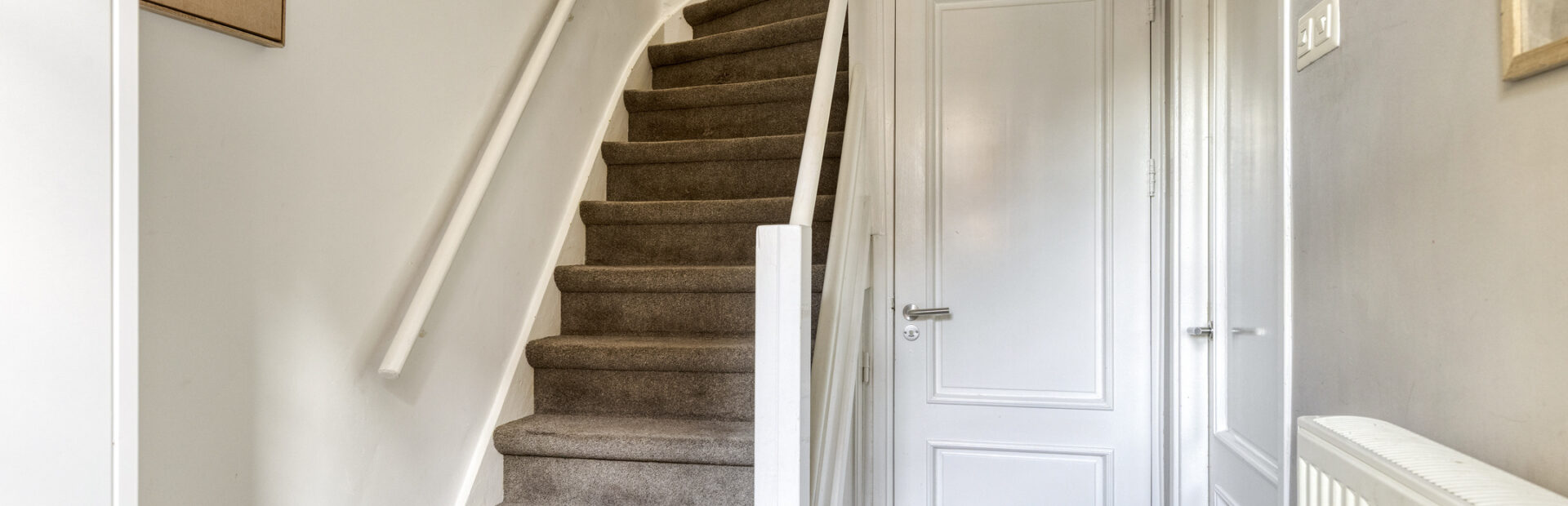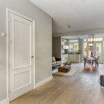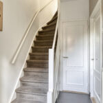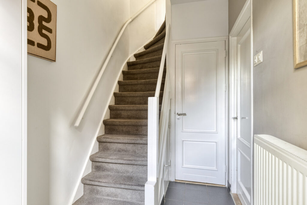 Entree met ruime hal met vloerbetegeling, toegang tot woonkamer en trapopgang naar de verdieping.