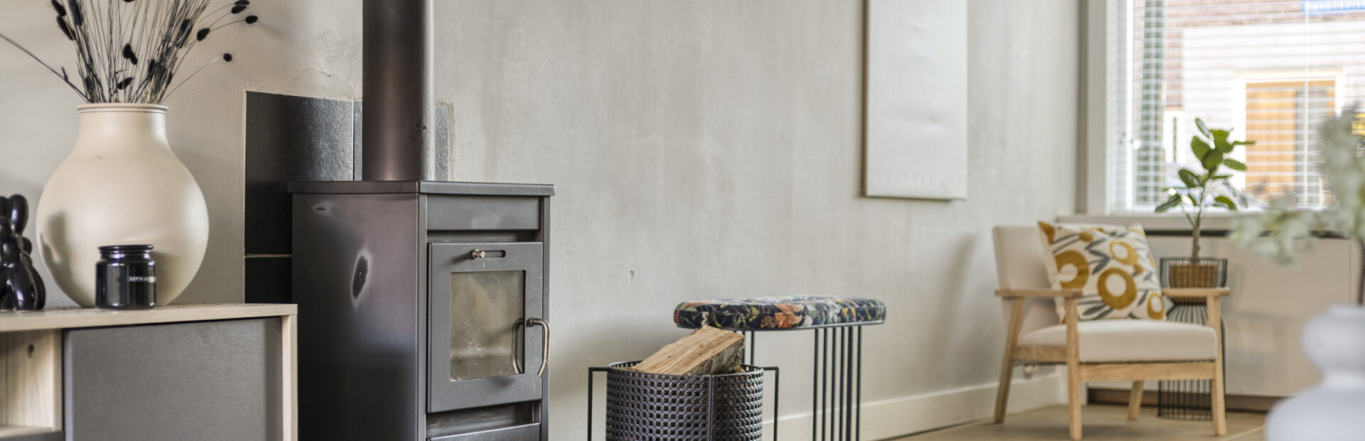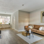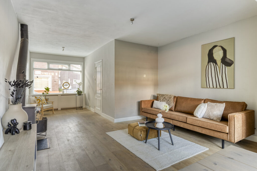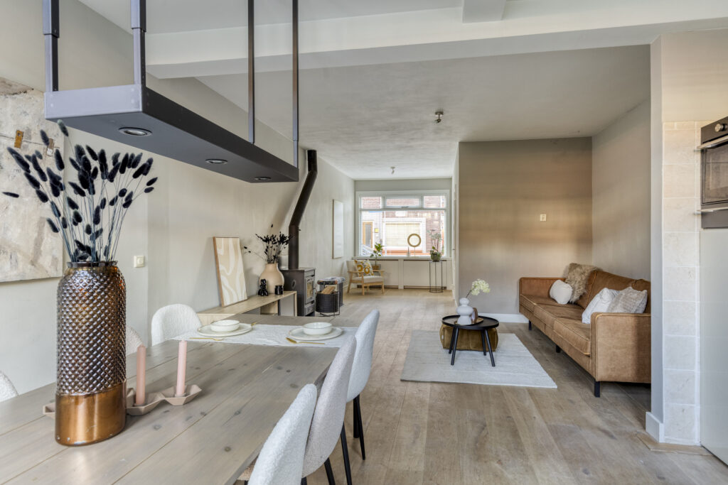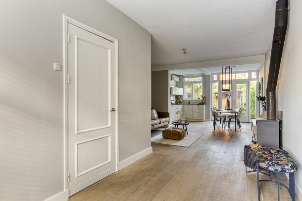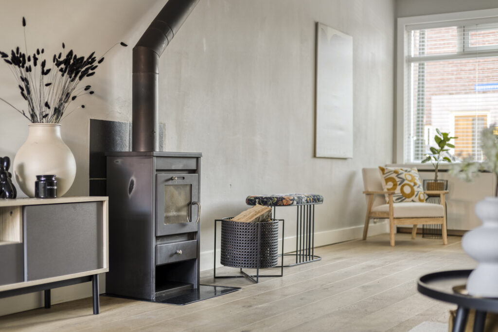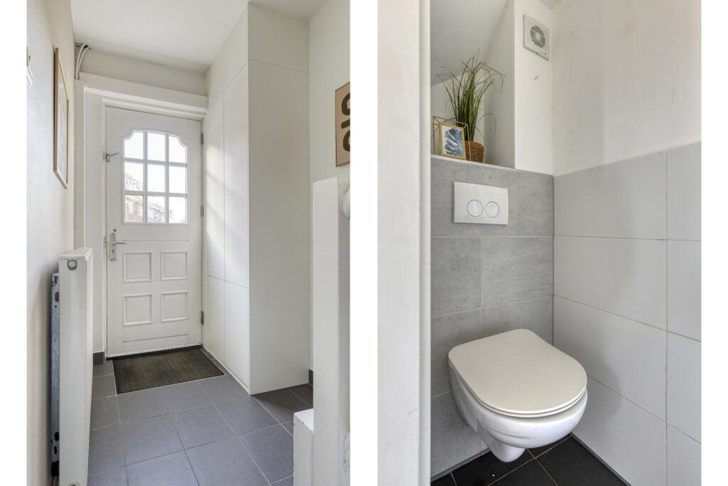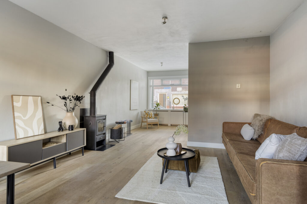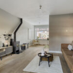 Gedeeltelijk betegelde toiletruimte met hangcloset en fonteintje. Royale uitgebouwde living met fraaie houten vloer, houtkachel en openslaande deuren naar de achtertuin.