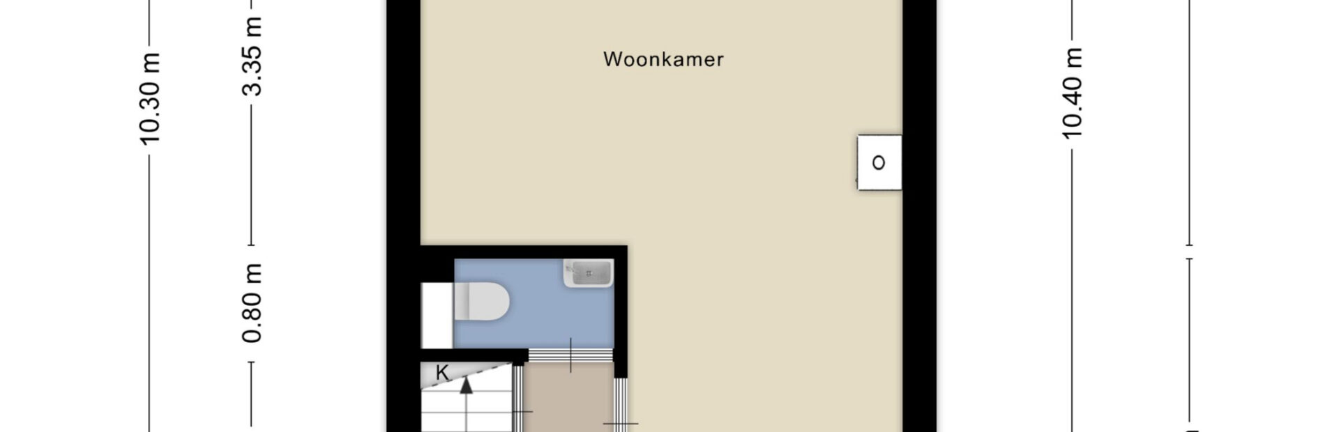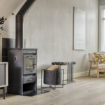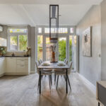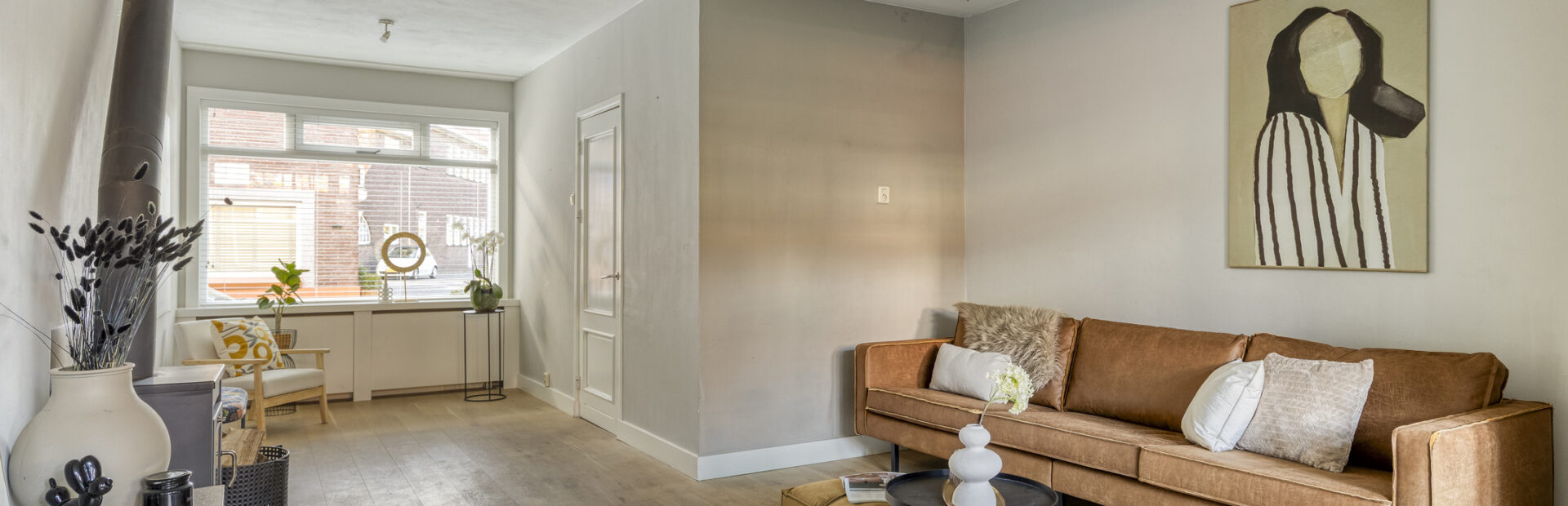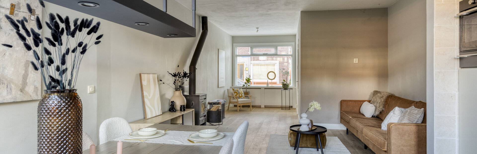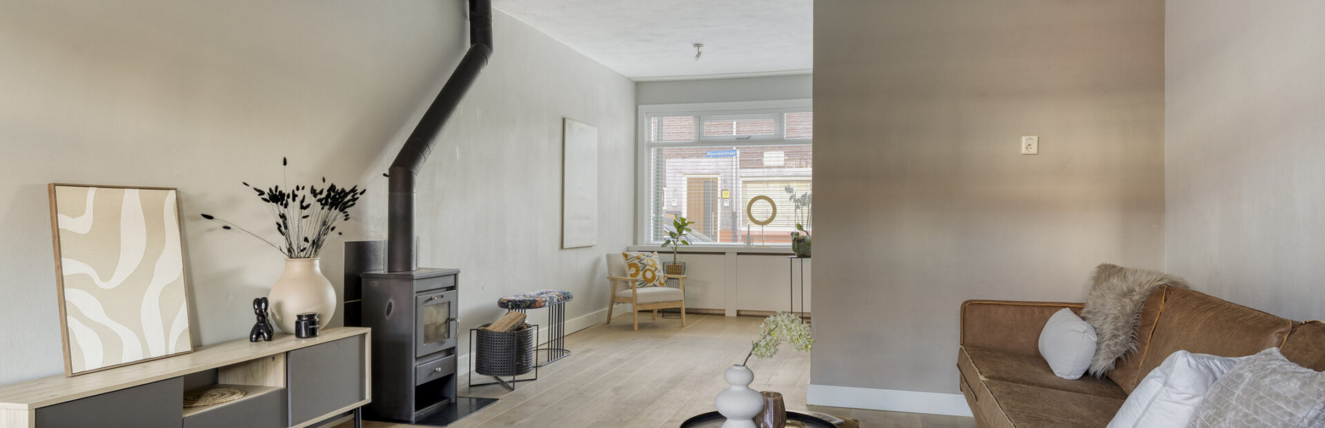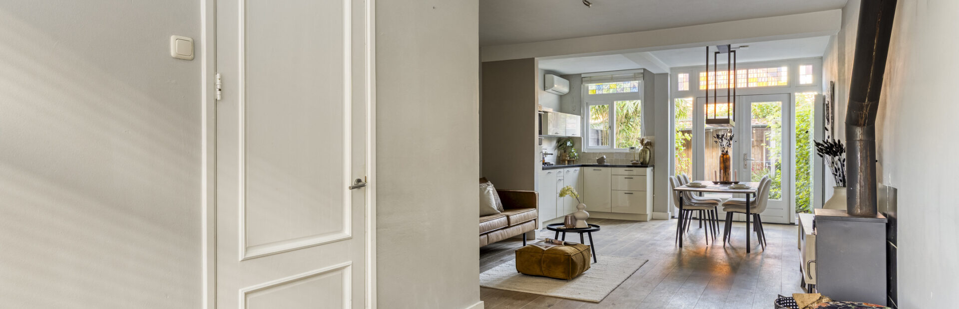Gedeeltelijk betegelde toiletruimte met hangcloset en fonteintje. Royale uitgebouwde living met fraaie houten vloer, houtkachel en openslaande deuren naar de achtertuin.