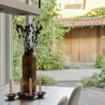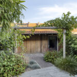 Gedeeltelijk bestrate en -overkapte achtertuin met fraai aangelegde beplanting.