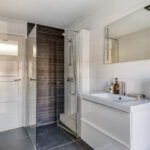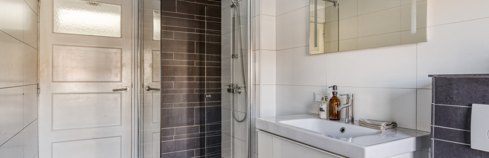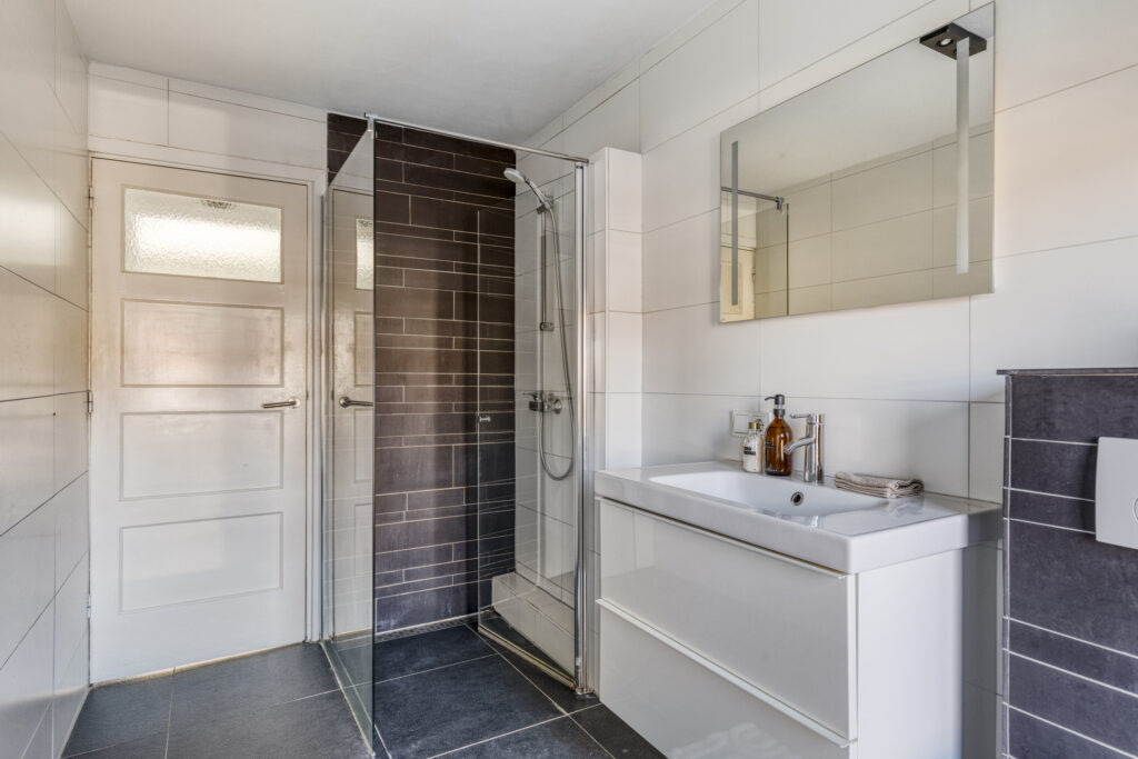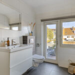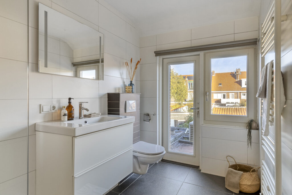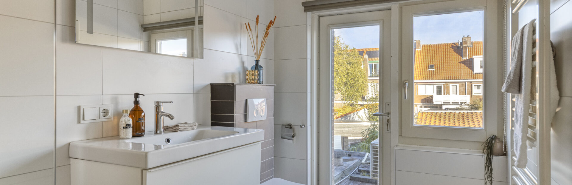 Volledig betegelde badkamer met inloopdouche, badkamermeubel met wastafel, hangend closet, designradiator en deur naar plat dak.