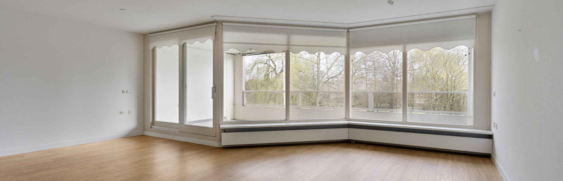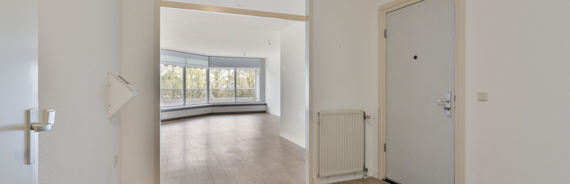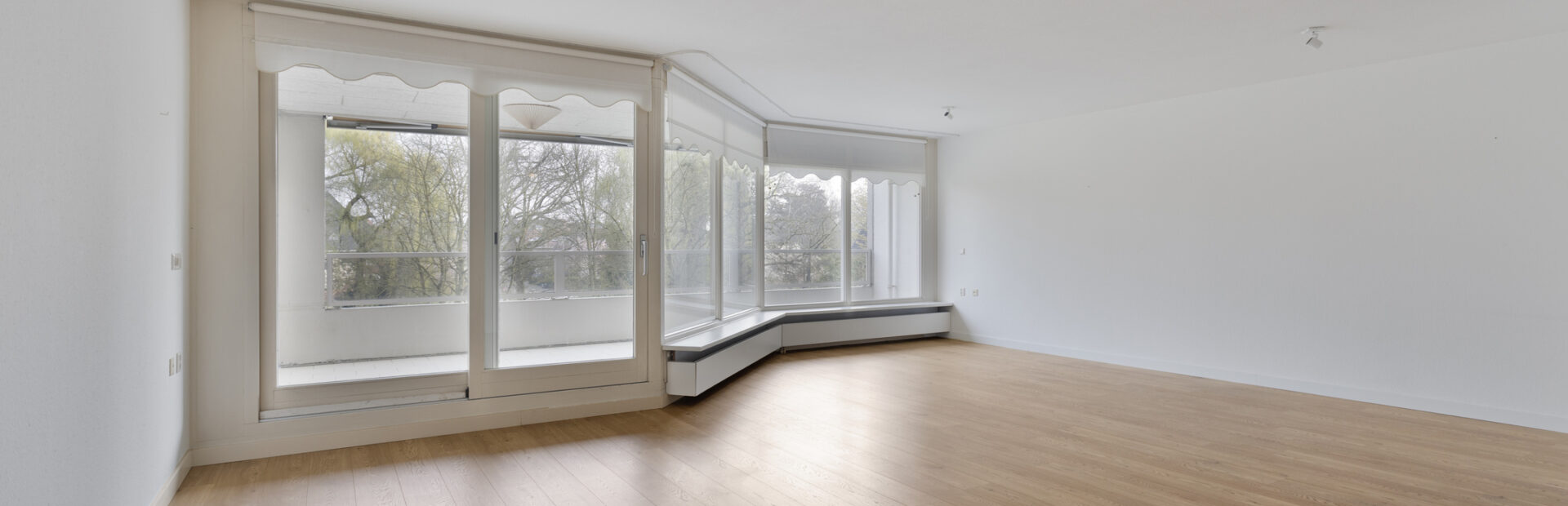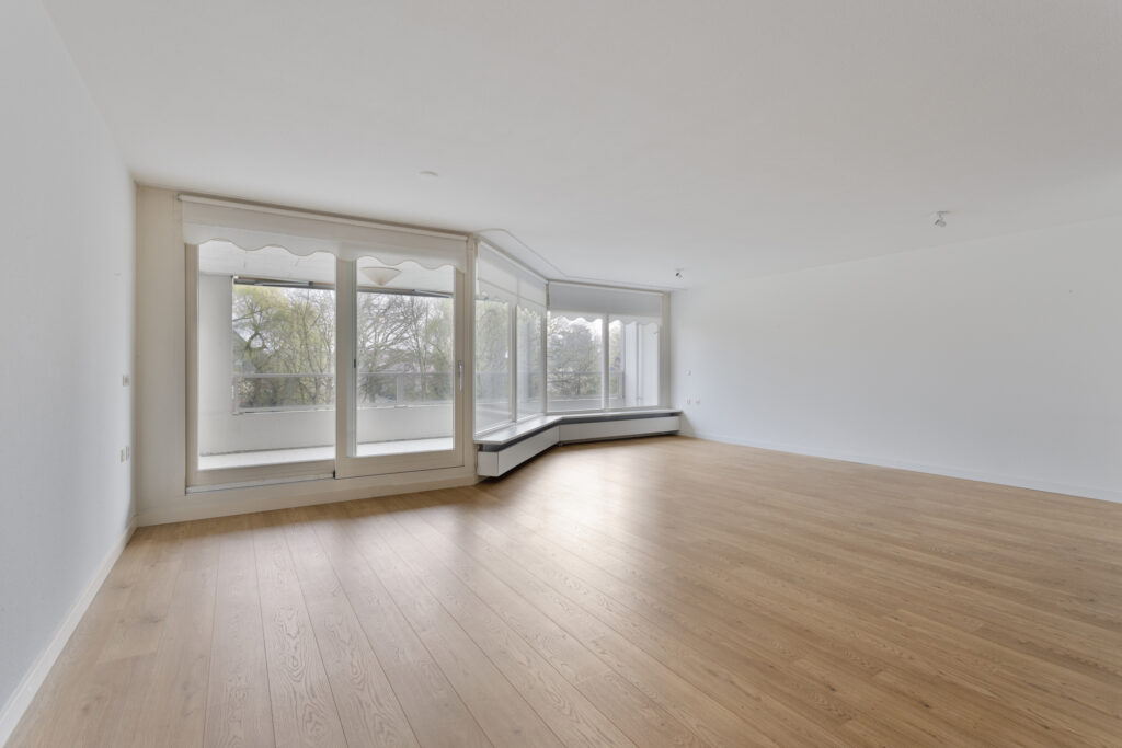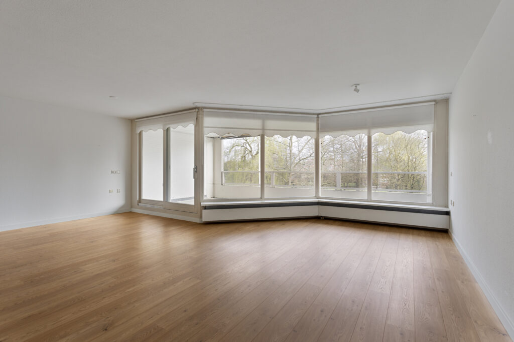 Royale woonkamer met vrij uitzicht en middels schuifpui toegang tot het ruime balkon met zonnewering.