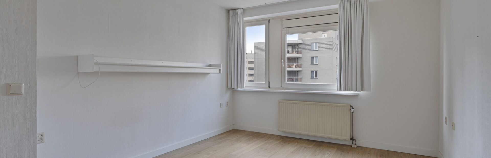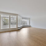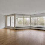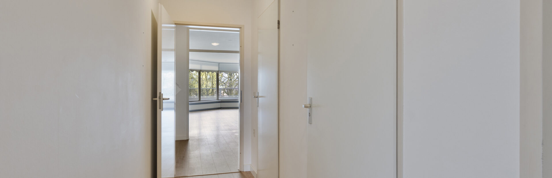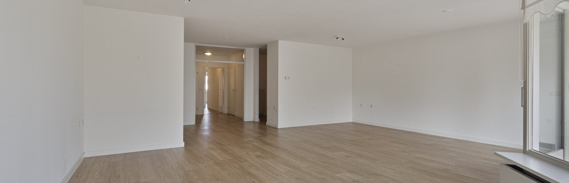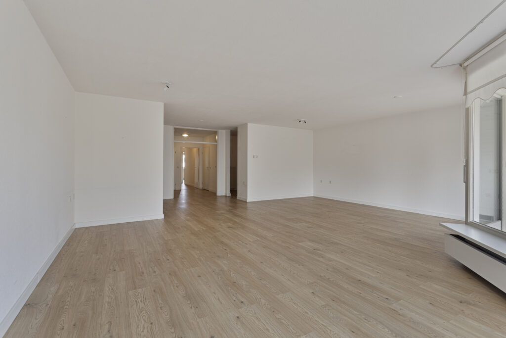 Royale woonkamer met vrij uitzicht en middels schuifpui toegang tot het ruime balkon met zonnewering.