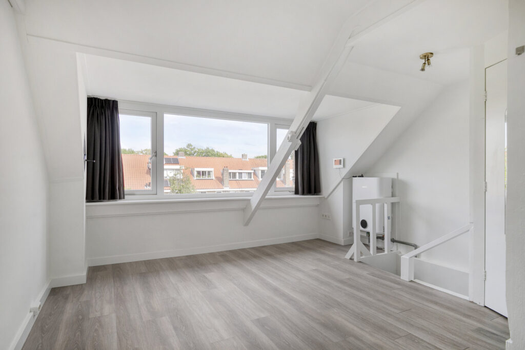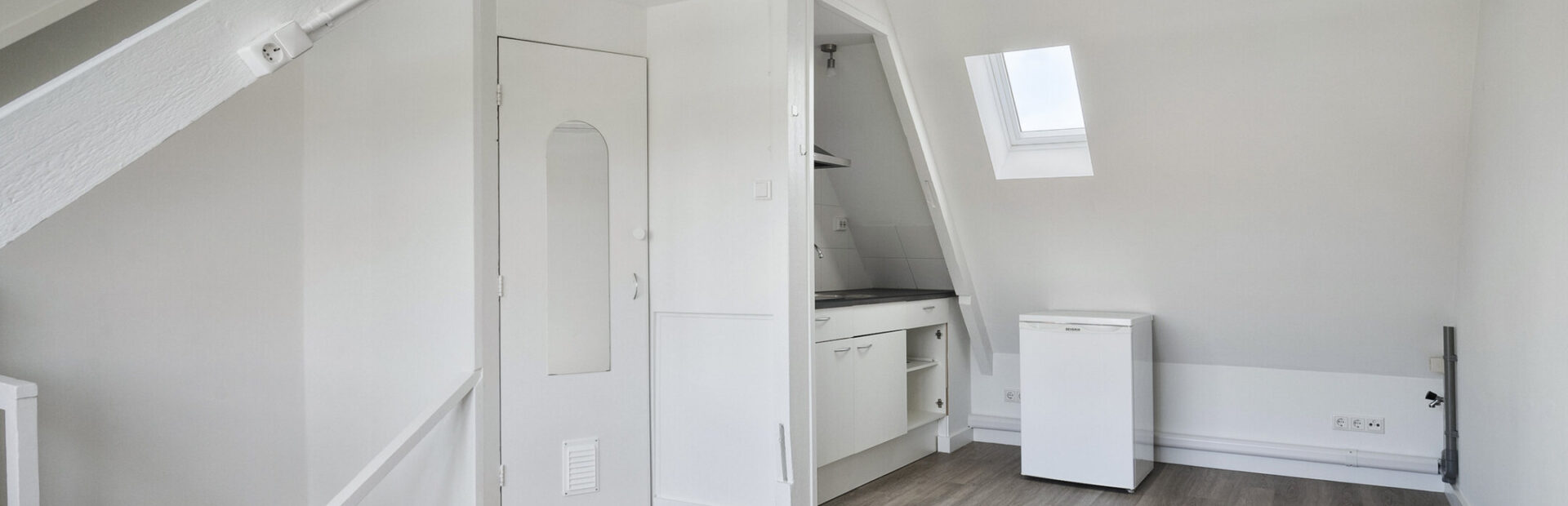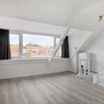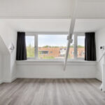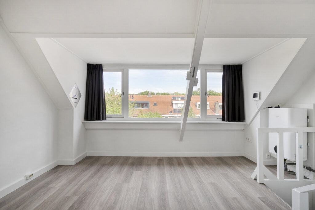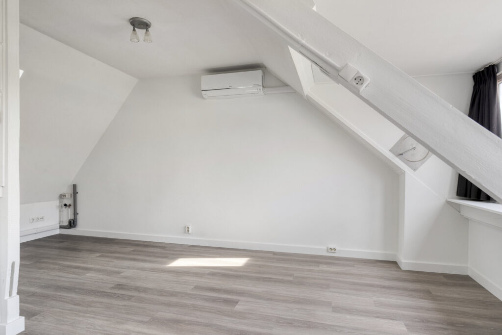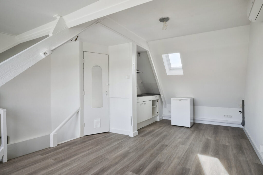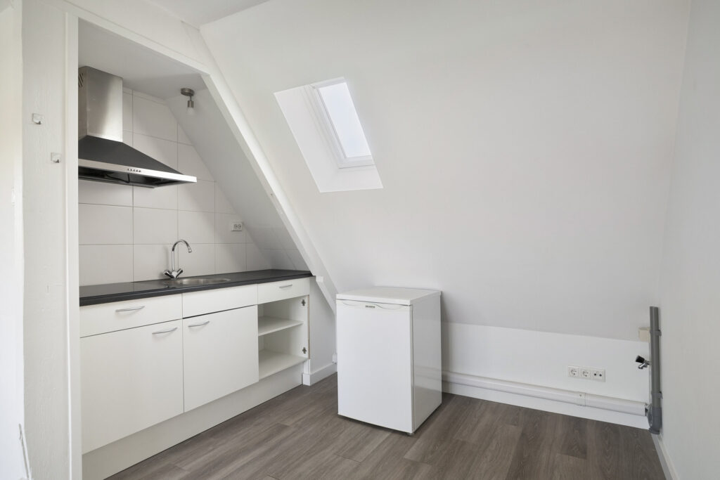 Lichte, modern afgewerkte studio met pvc-vloer, grote dakkapel aan de achterzijde en dakraam aan de voorzijde.