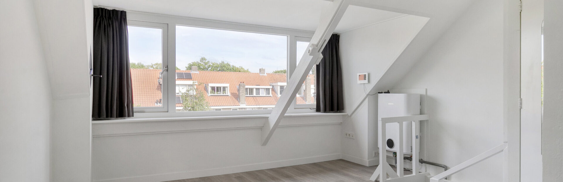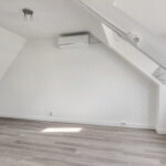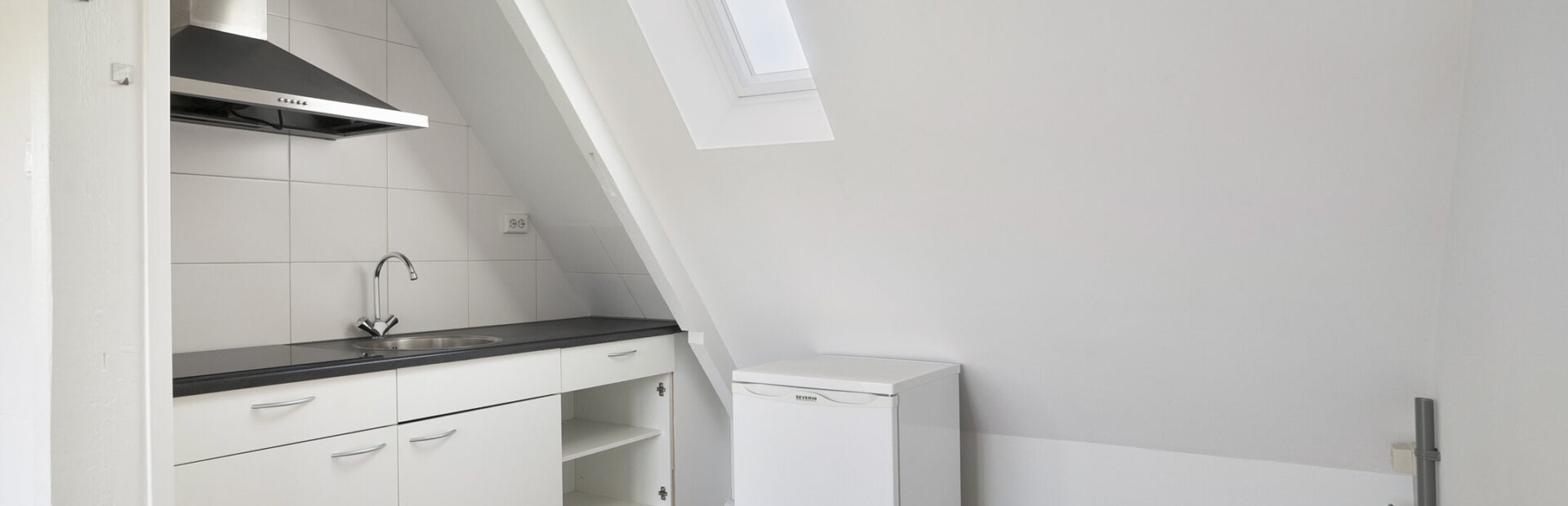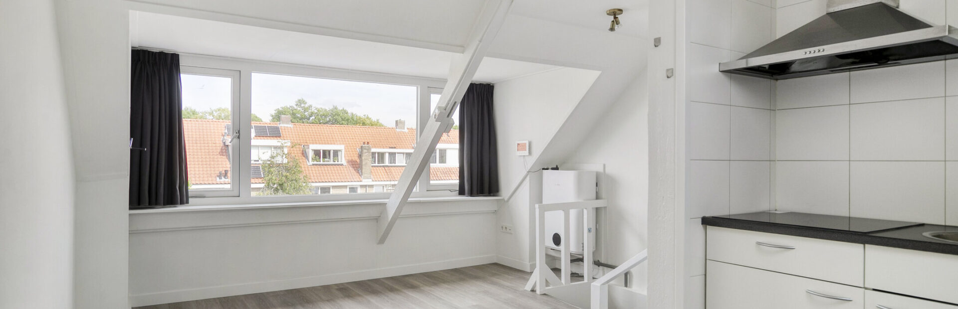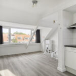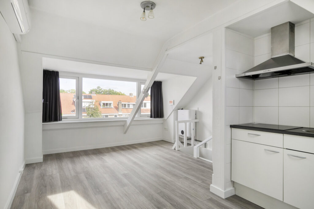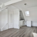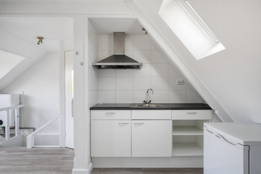 Lichte, modern afgewerkte studio met pvc-vloer, grote dakkapel aan de achterzijde en dakraam aan de voorzijde.