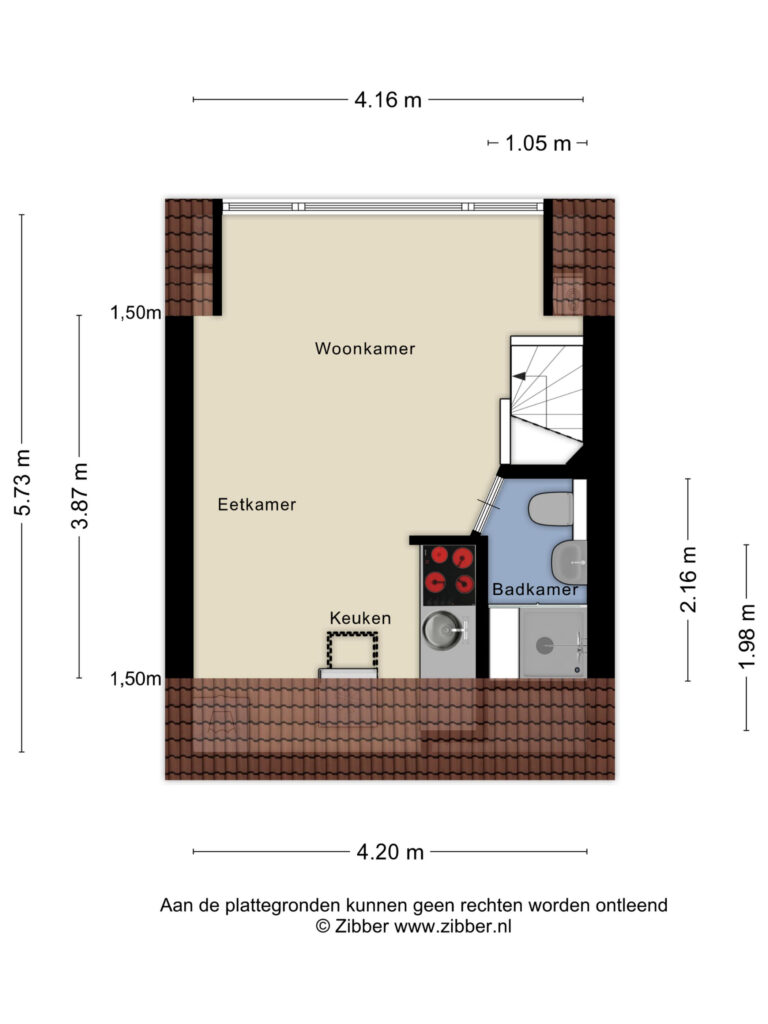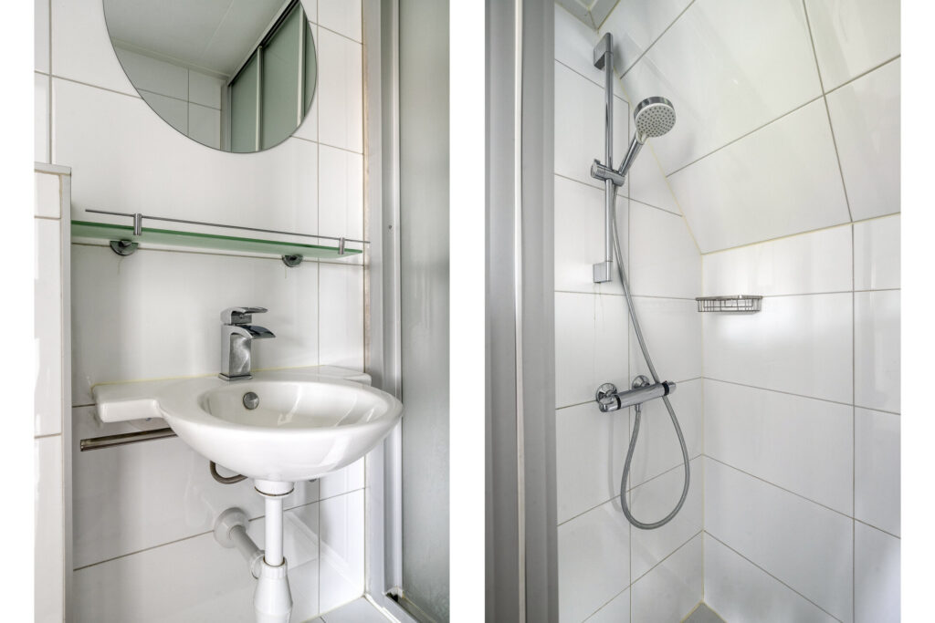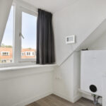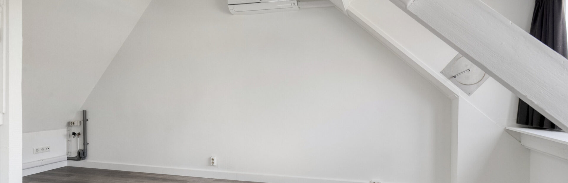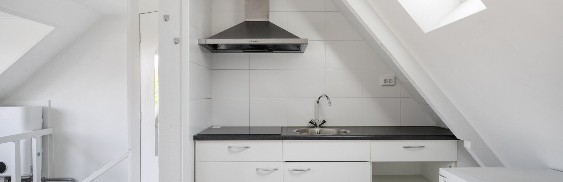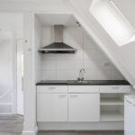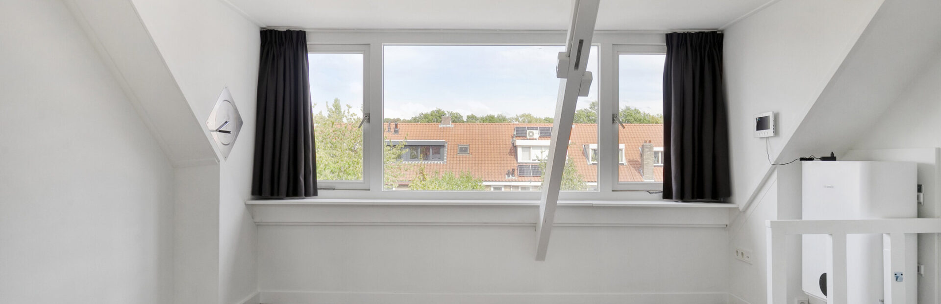 Lichte, modern afgewerkte studio met pvc-vloer, grote dakkapel aan de achterzijde en dakraam aan de voorzijde.