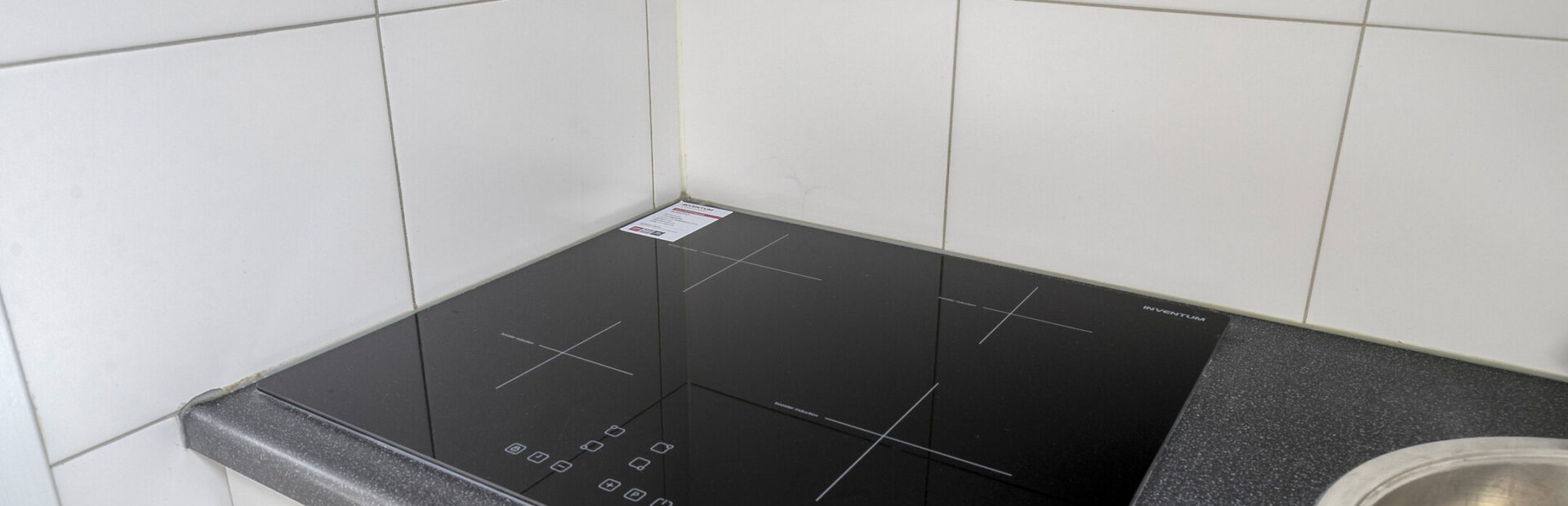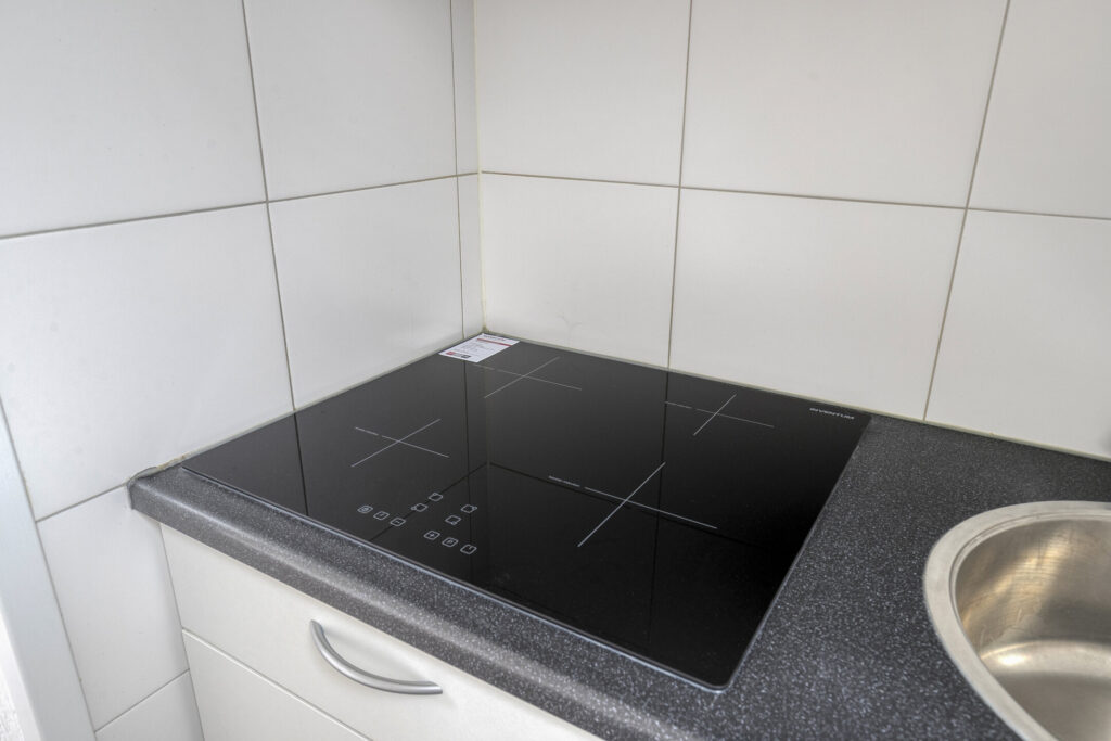 Keukenopstelling voorzien van inbouwapparatuur, te weten: inductie-kookplaat, afzuigkap en losse koelkast.
