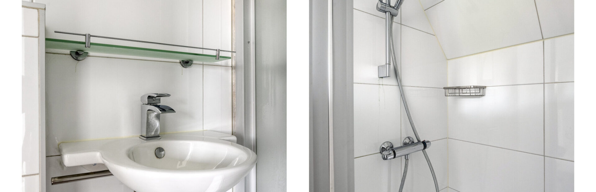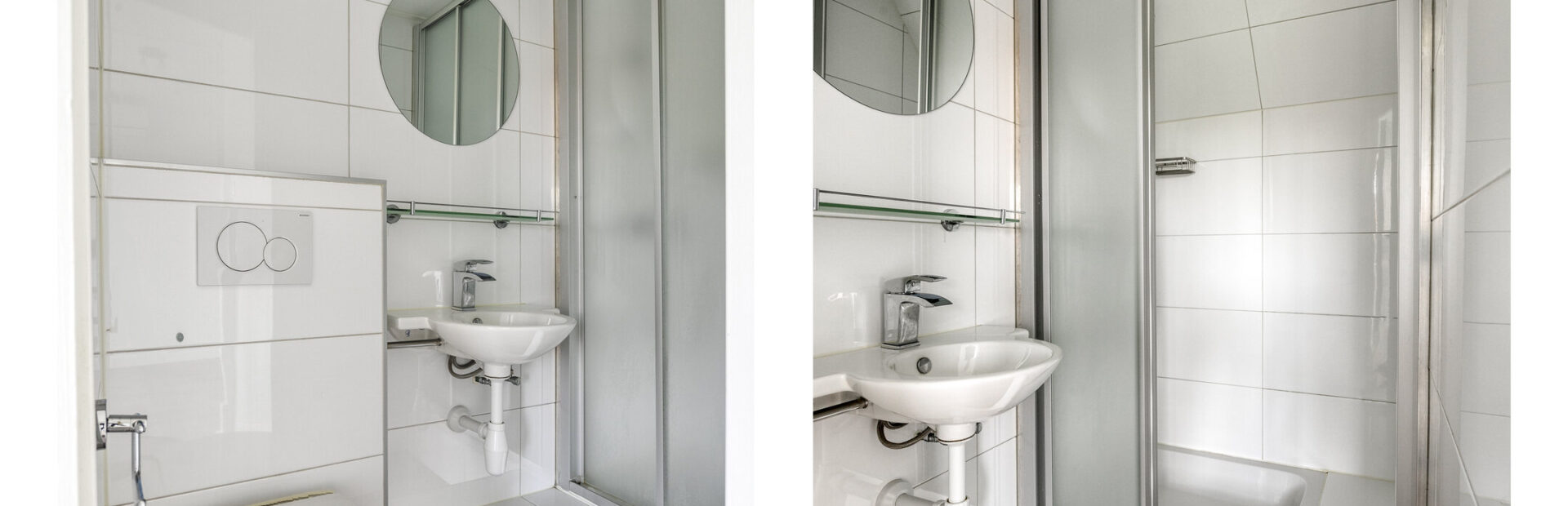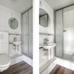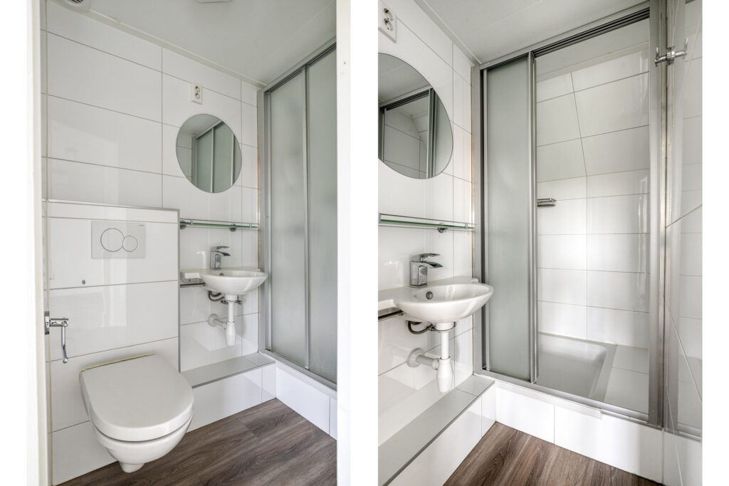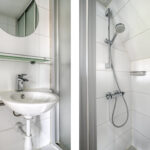Badkamer met hangend closet, wastafel en douche.
