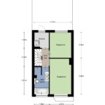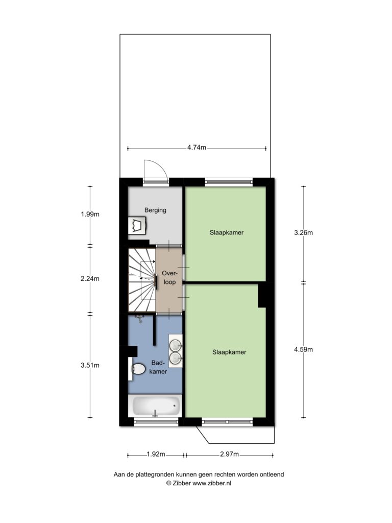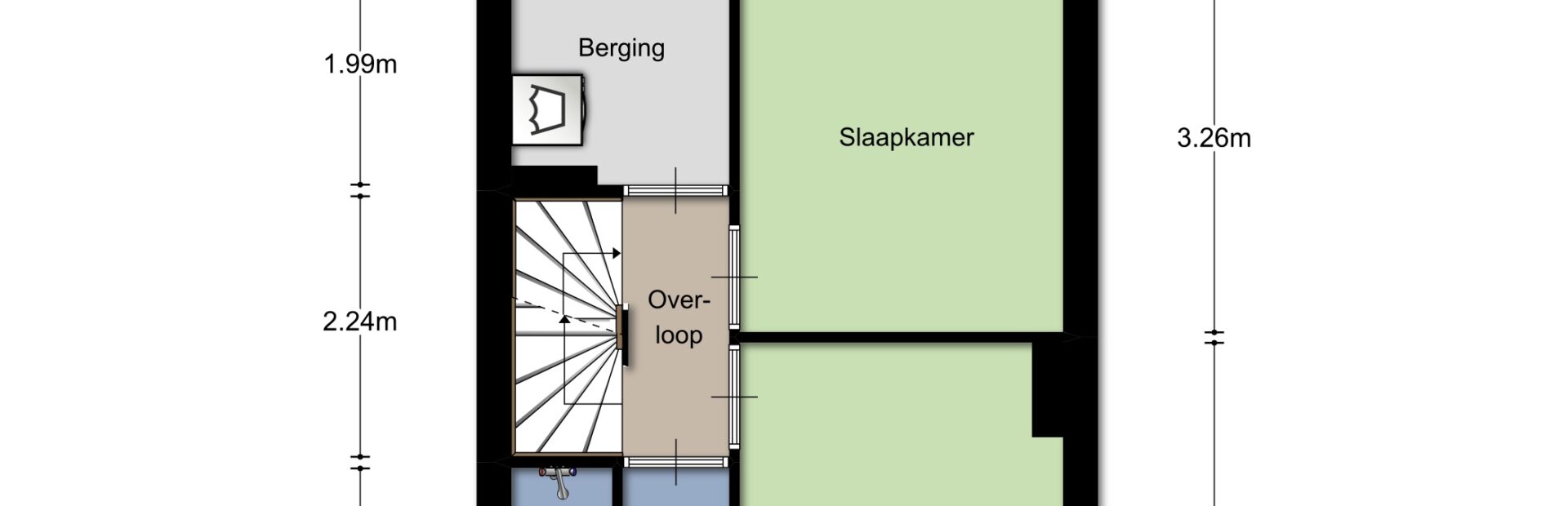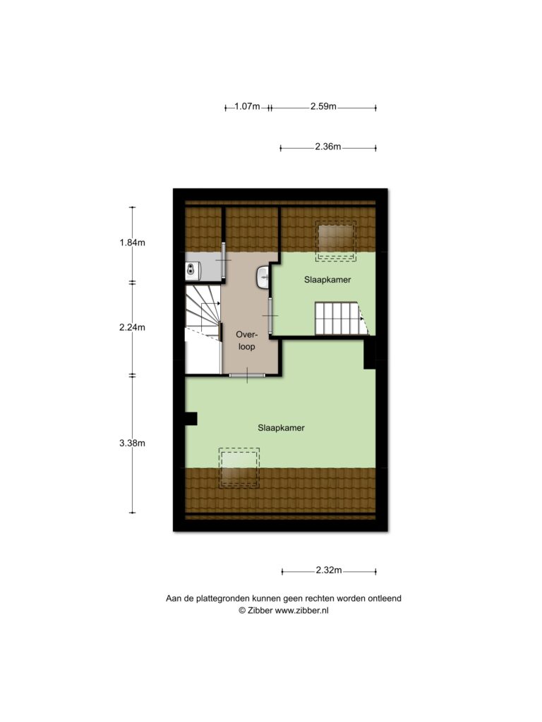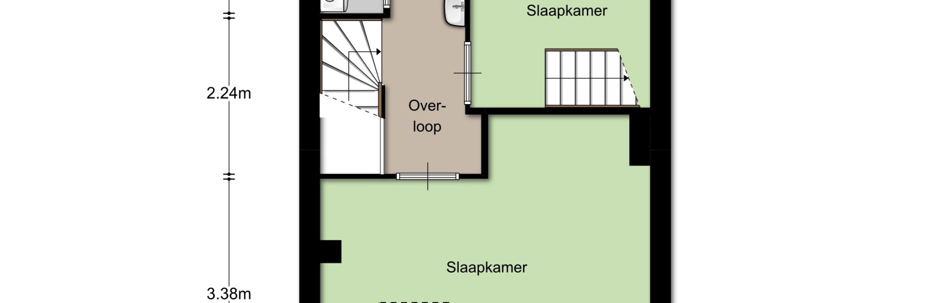 Overloop. 2 ruime slaapkamers aan de voor- en achterzijde van de woning. Wasruimte met deur naar platte dak.