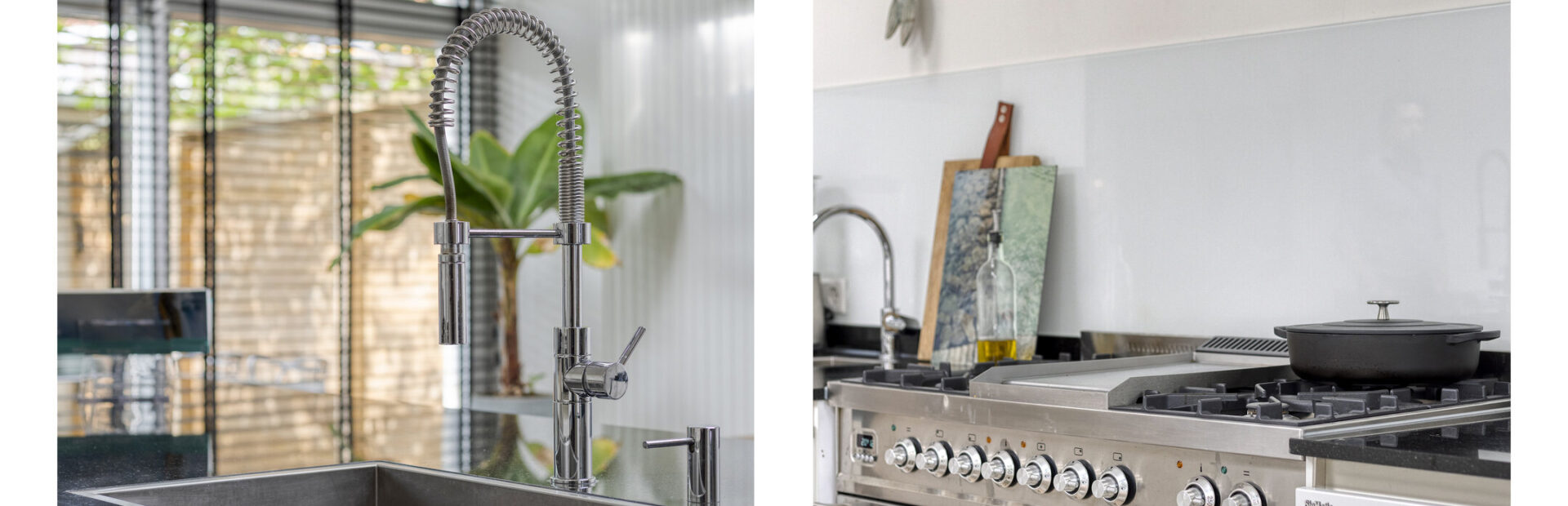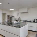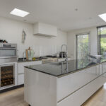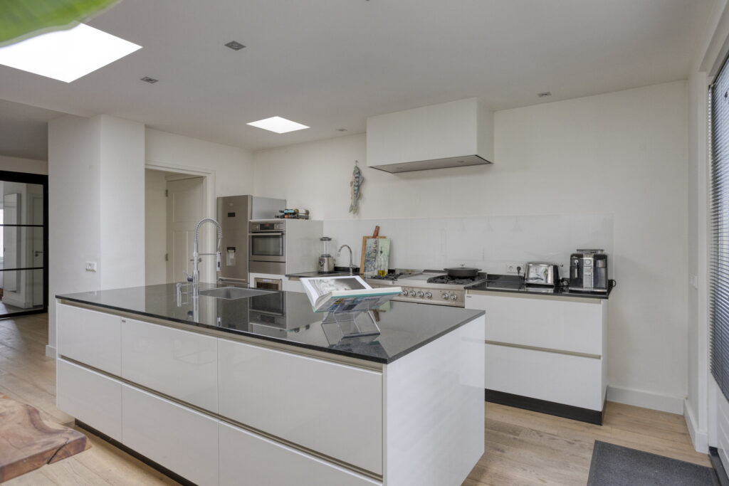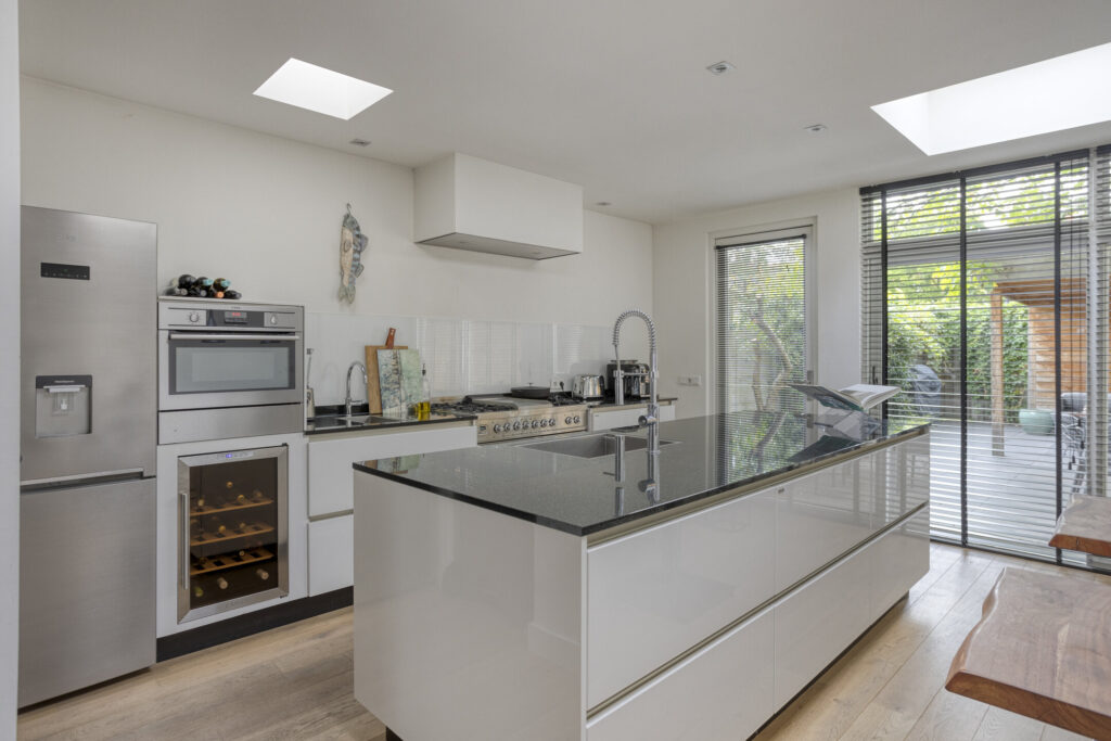 Luxe woonkeuken met kelderkast, voorzien van diverse (inbouw)apparatuur, te weten: koel-vries combinatie, wijnklimaatkast, combi-oven, gaskookstel en afzuigkap en vaatwasser..