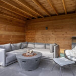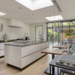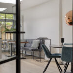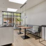 Royale uitgebouwde living voorzien van luxe houten vloer. Er is volop daglicht door de aanwezige lichtkoepels.
