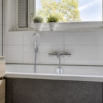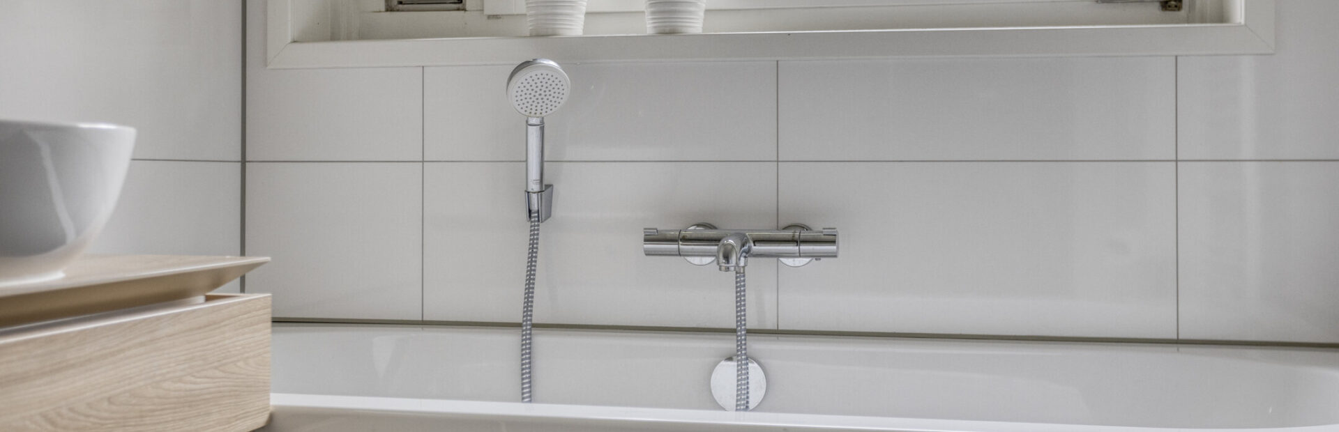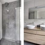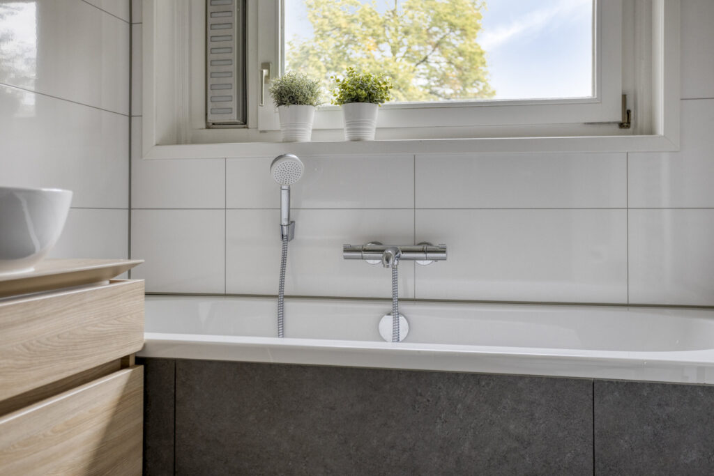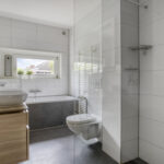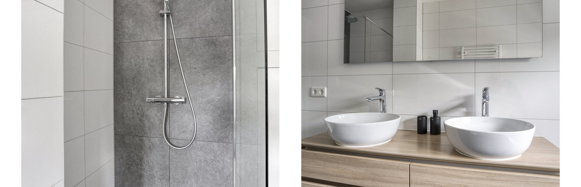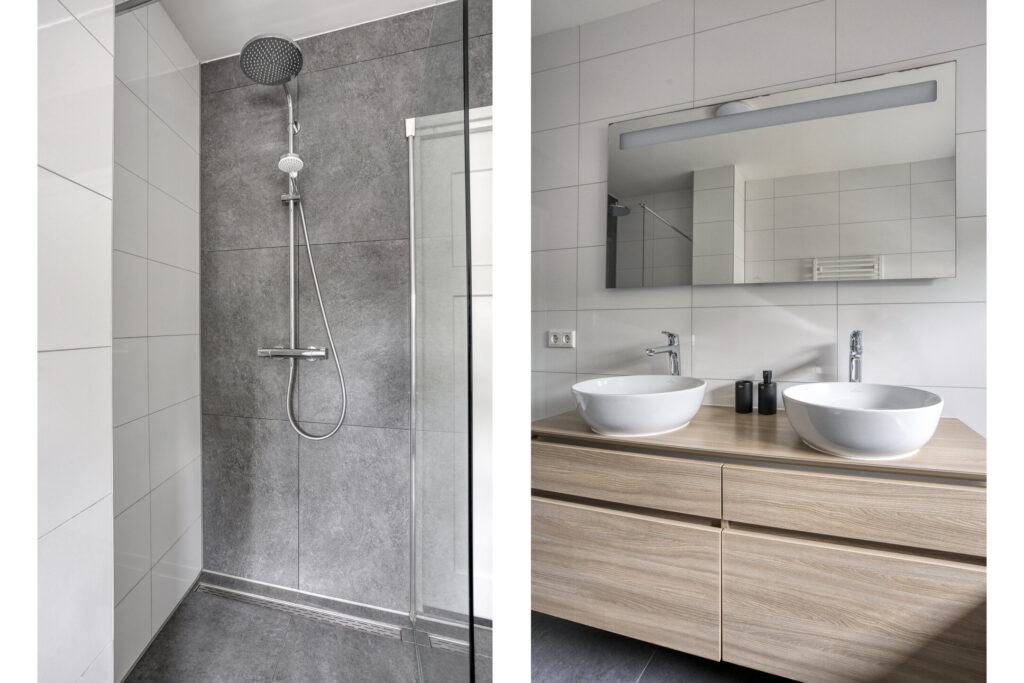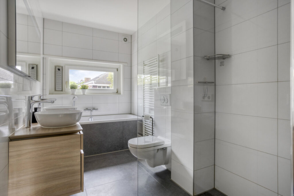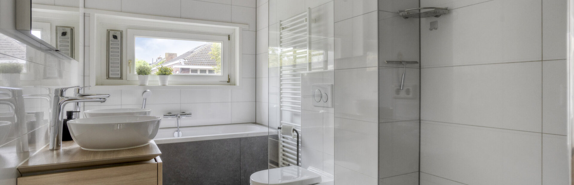 Luxe badkamer met ligbad, inloopdouche, toilet en dubbel wastafelmeubel.