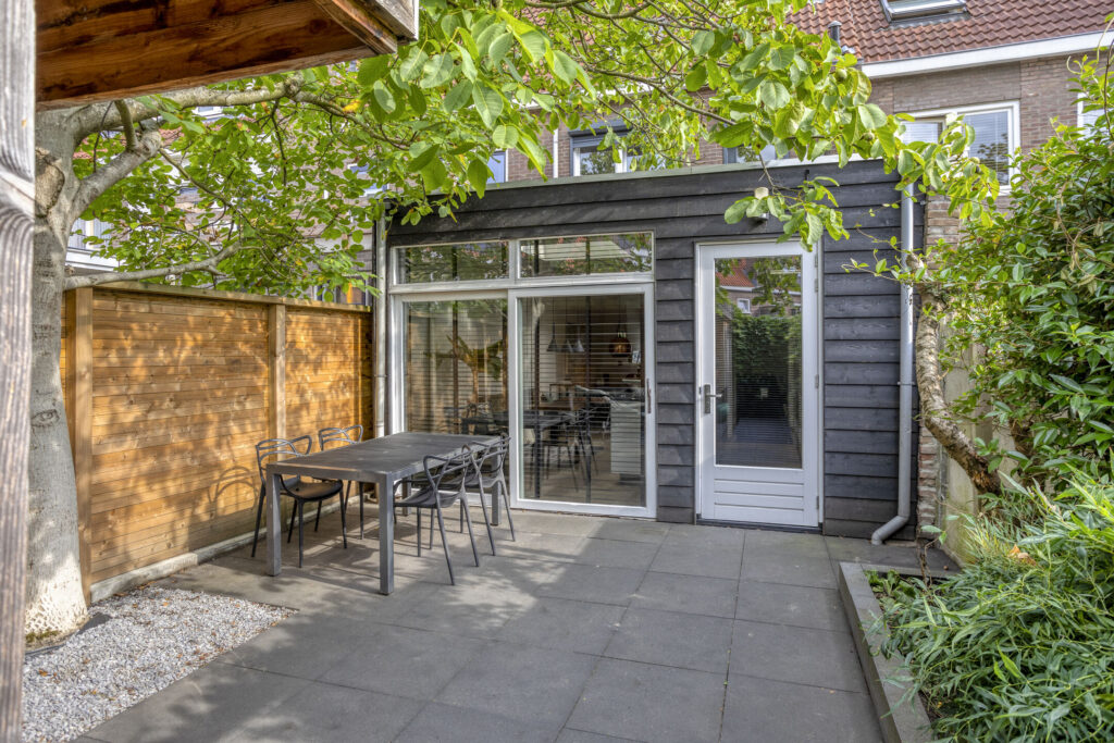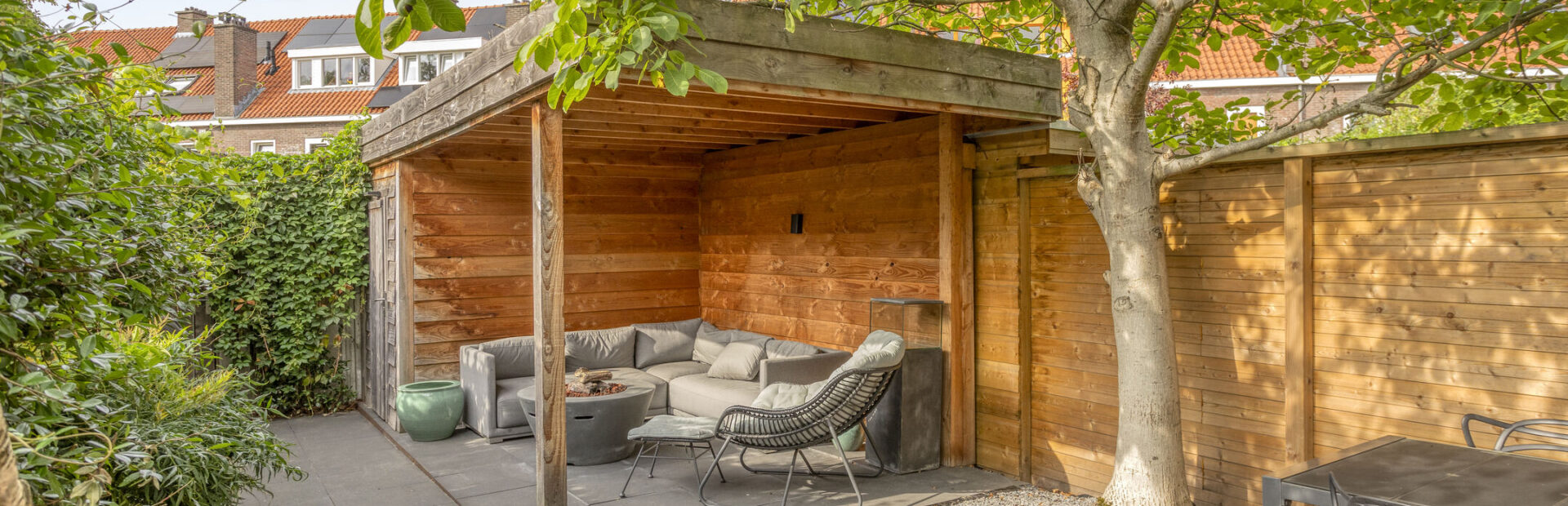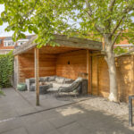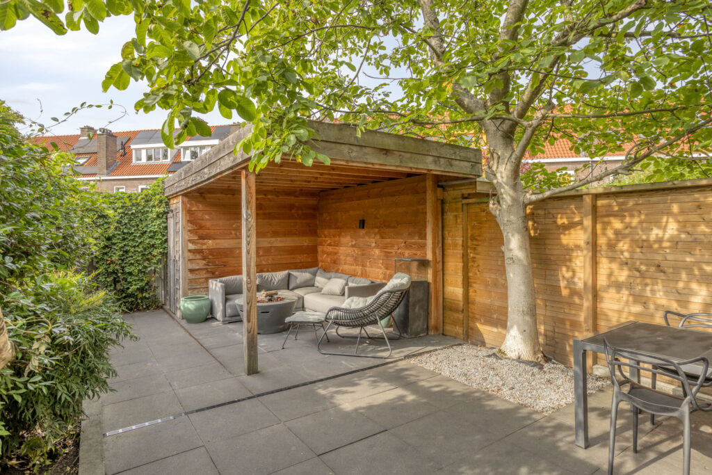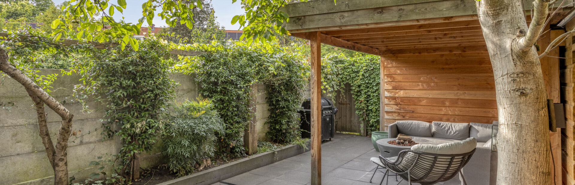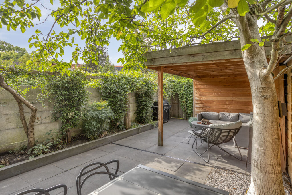 Fraai aangelegde achtertuin met ligging op het Noord-Westen met berging, overdekt terras en achterom.