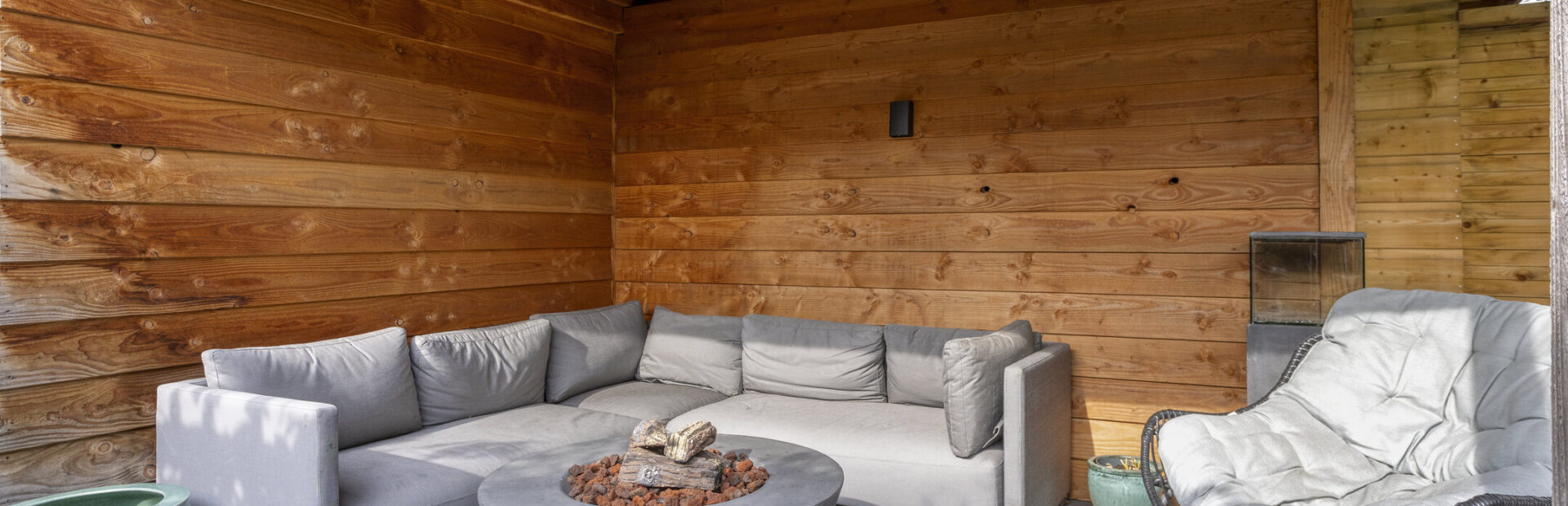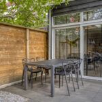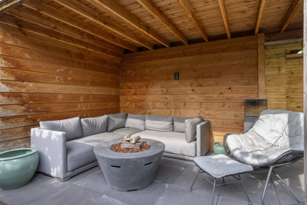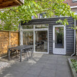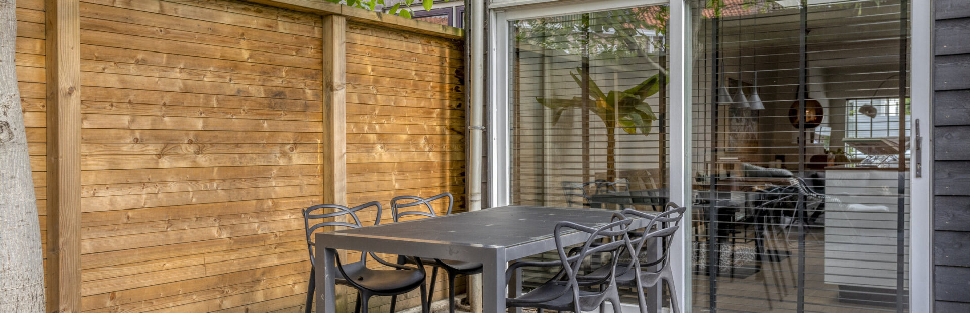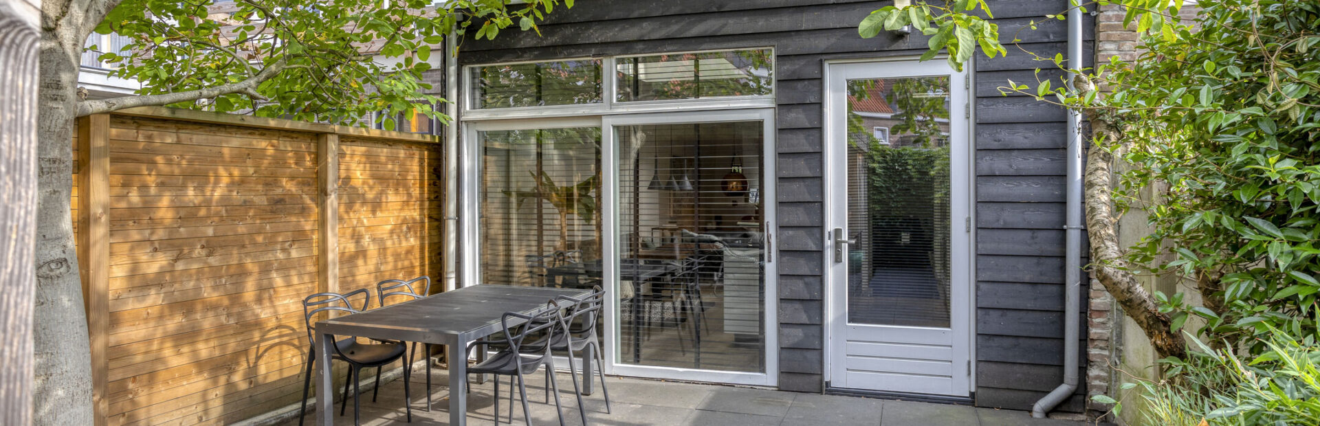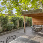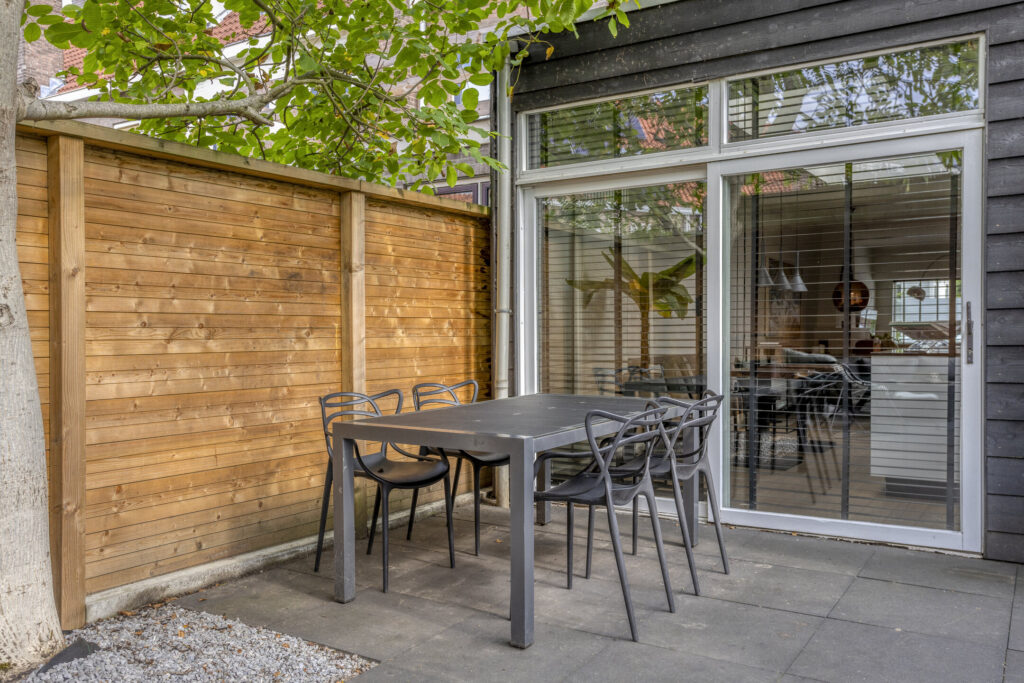 Fraai aangelegde achtertuin met ligging op het Noord-Westen met berging, overdekt terras en achterom.
