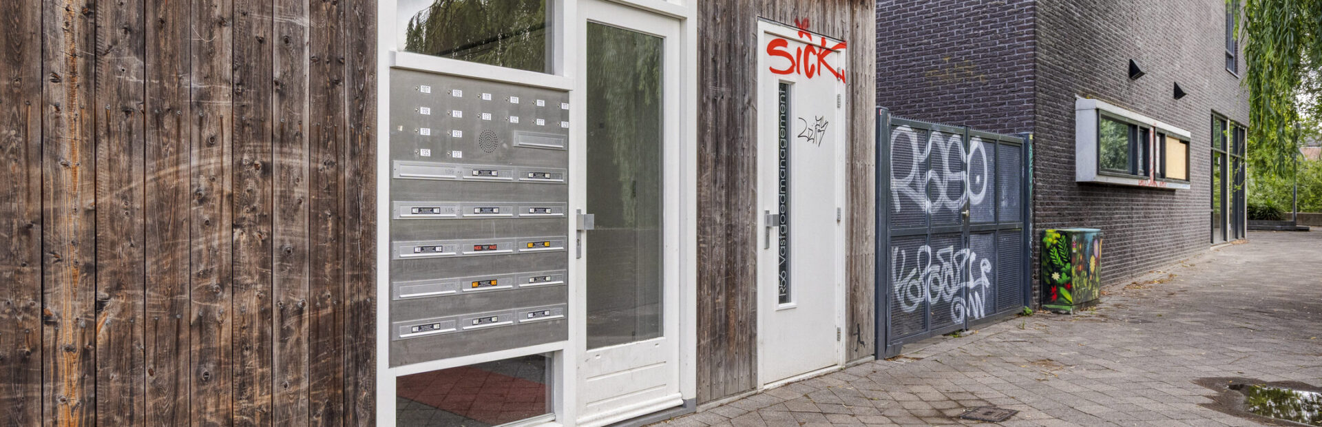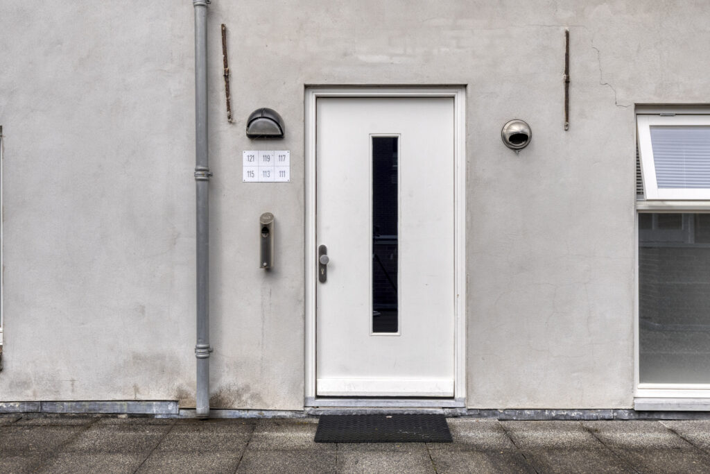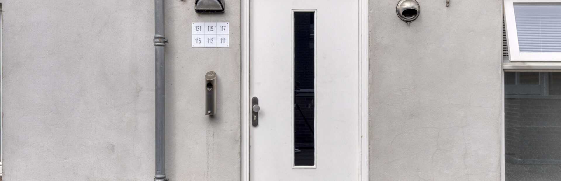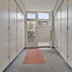 Representatieve ontvangsthal voorzien van brievenbussen, centraal belpaneel met videofoon, meterkasten en trapopgang.