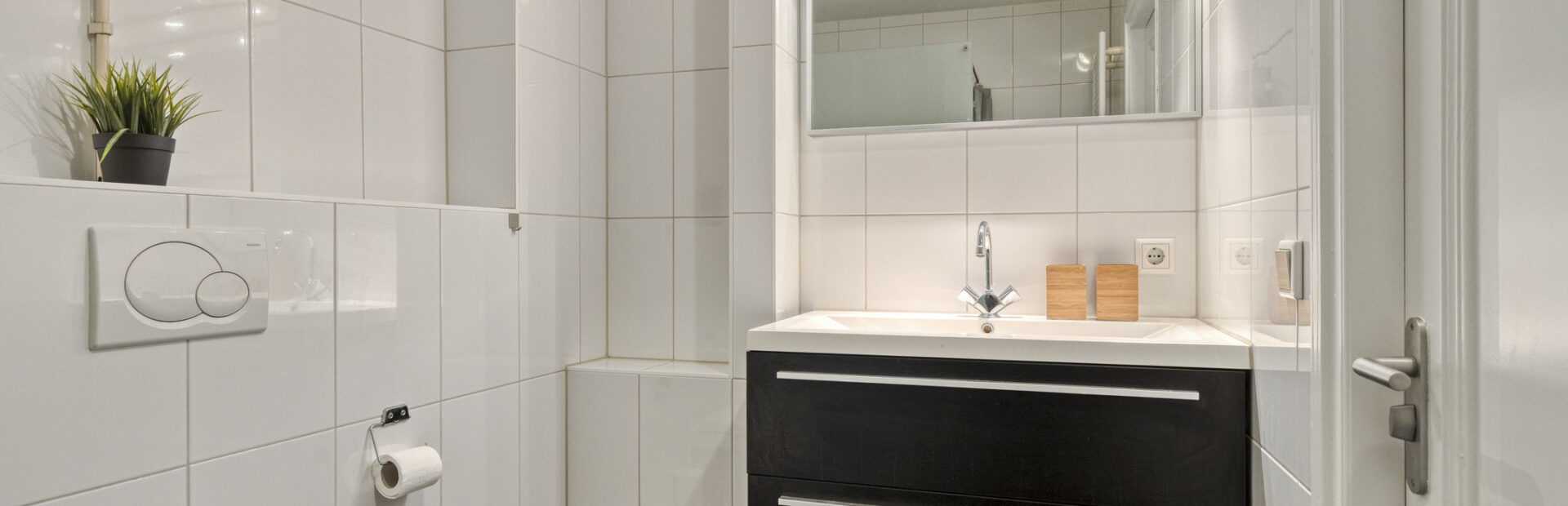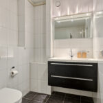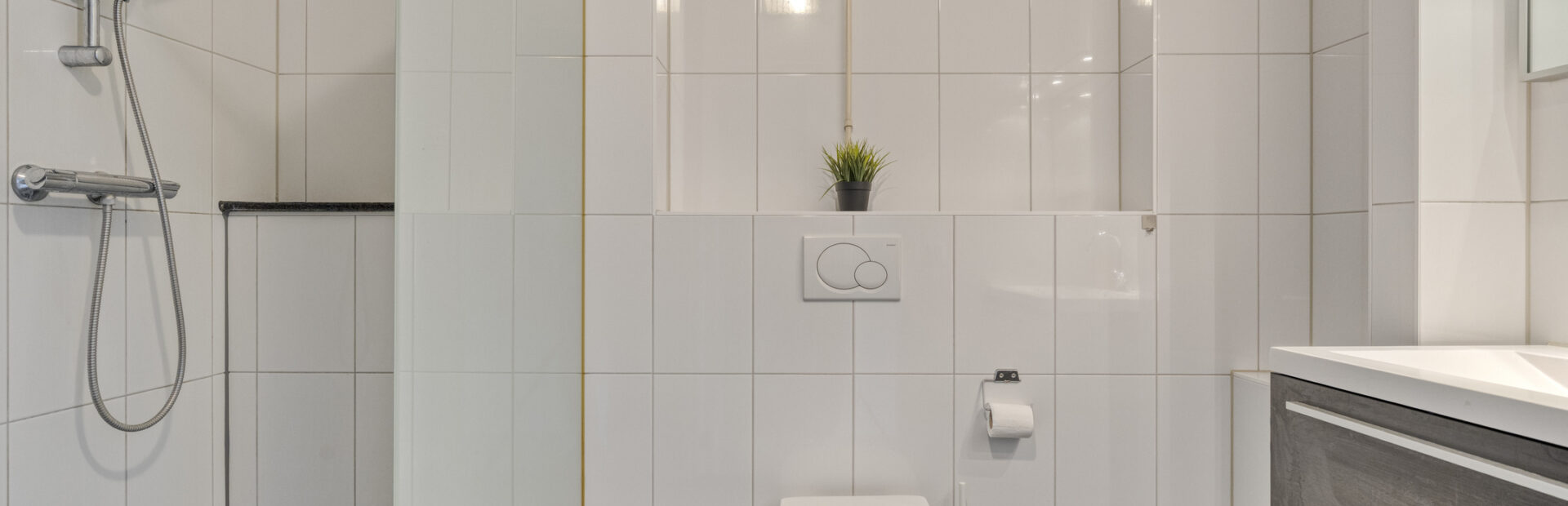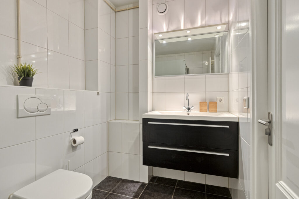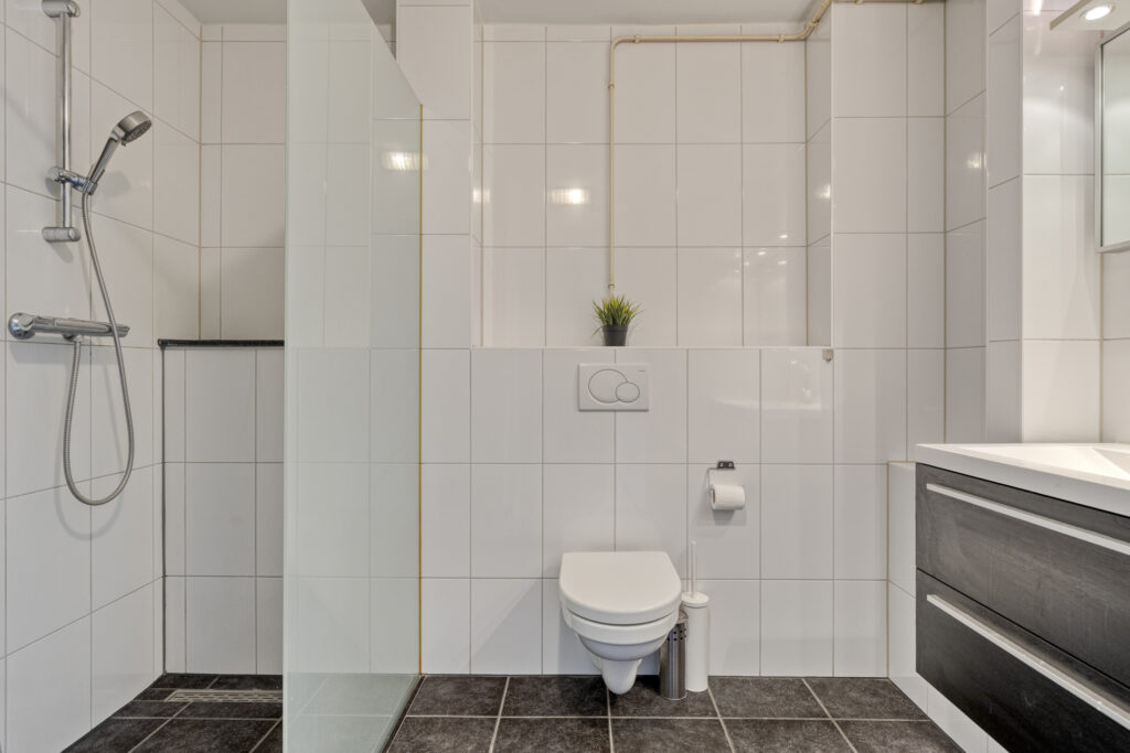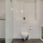 Nette badkamer met inloopdouche, wastafelmeubel en hangend closet.